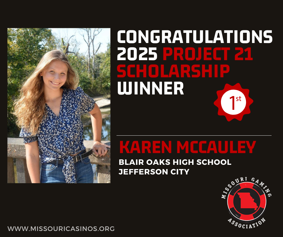 JEFFERSON CITY, MO – Karen McCauley of Jefferson City, Missouri, a high school senior at Blair Oaks High School has been awarded the first-prize scholarship through the 29th annual Project 21 Scholarship competition, which was developed to educate young people about the issues and dangers of underage gambling. She will receive a $2,500 scholarship towards tuition at the University of Missouri – Columbia where she plans to earn a degree in architecture. Sponsored by the Missouri Gaming Association, the statewide professional association of the Missouri casino industry, $198,500 Project 21 scholarships have been awarded to date.